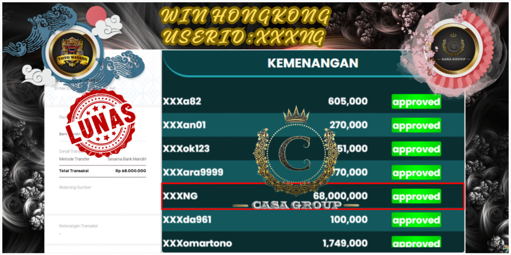 Selamat atas jackpot paus untuk member TOTOWAYANG dengan user id : xxxng yang telah berhasil menang pada pasaran HONGKONG sebesar Rp. 68.000.000 ,-