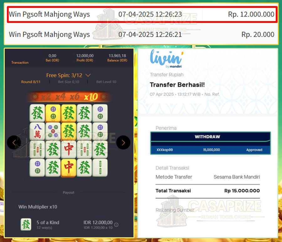 CASAPRIZE LAGI HOKI !! WIN LAGI DI MAHYONG WAYS PG SOFT SEBESAR 15 JT !!