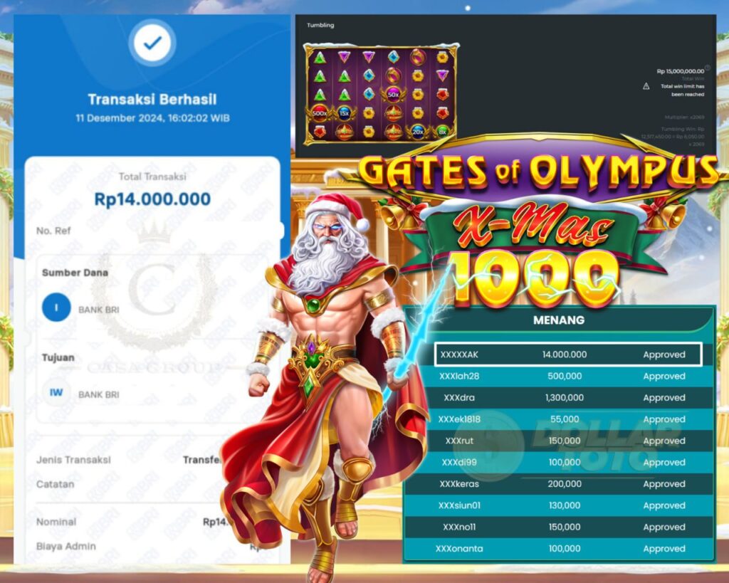 Selamat kepada bosku yang bermain di DOLLARTOTO dengan user id XXXXXAK yang telah mendapatkan kemenangan besar di game GATES OF OLYMPUS X-MAS 1000 > PRAGMATIC SLOT