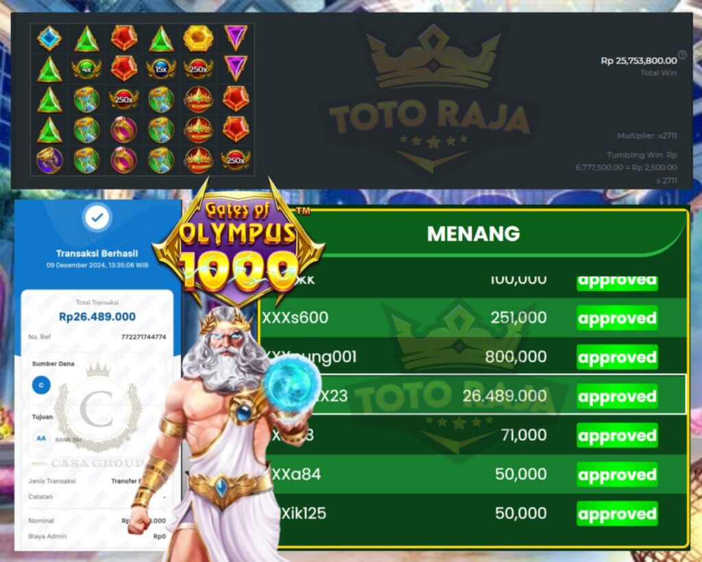Selamat kepada bosku yang bermain di TOTORAJA dengan user id XXXXXXX23 yang telah mendapatkan kemenangan besar di game GATES OF OLYMPUS 1000 > PRAGMATIC SLOT