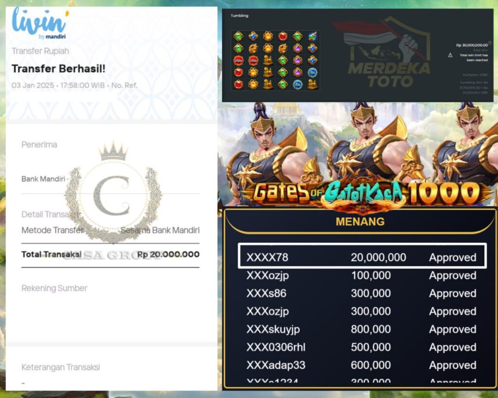 Selamat kepada member MERDEKATOTO user id XXXX78 yang telah mendapatkan kemenangan besar di game PRAGMATIC PLAY >> GATES OF GATOT KACA 1000