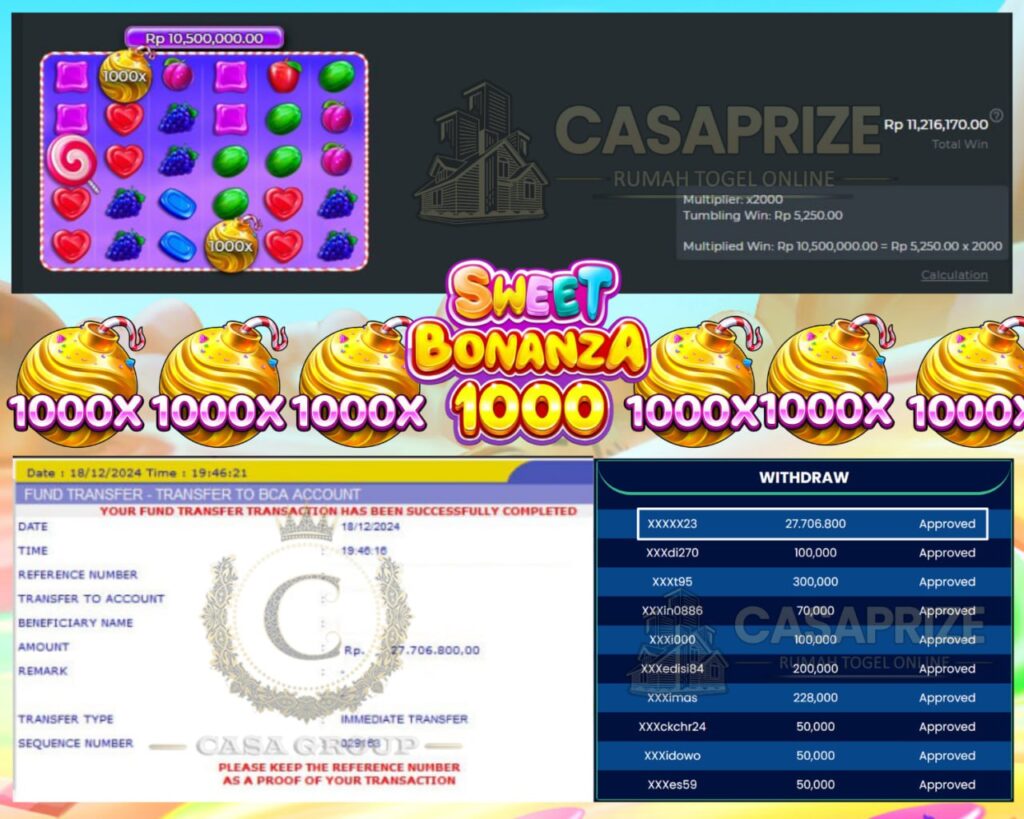 Selamat kepada member CASAPRIZE user id XXXXX23 yang telah mendapatkan kemenangan besar di game PRAGMATIC >> SWEET BONANZA 1000.