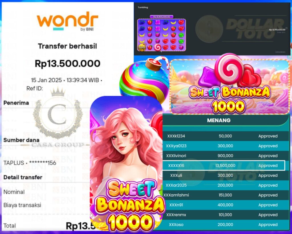 Selamat kepada member DOLLARTOTO user id XXXXX16 yang telah mendapatkan kemenangan besar di game PRAGMATIC PLAY >> SWEET BONANZA 1000.