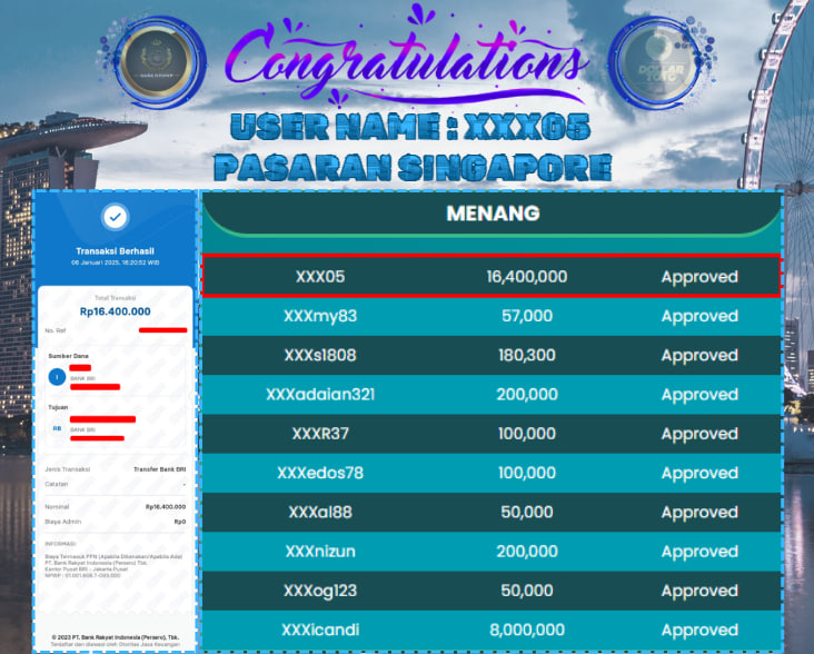 SELAMAT UNTUK KEMENANGAN BESAR PADA PASARAN SINGAPORE KEPADA MEMBER DOLLARTOTO DENGAN USER ID : XXX05 SEBESAR Rp.16.400.000,-