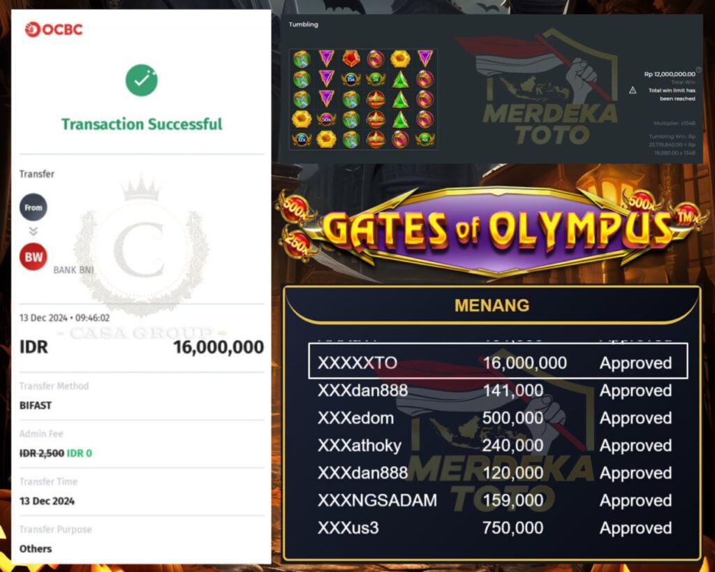 Selamat kepada bosku yang bermain di MERDEKATOTO dengan user id XXXXXXTO yang telah mendapatkan kemenangan besar di game GATES OF OLYMPUS > PRAGMATIC SLOT