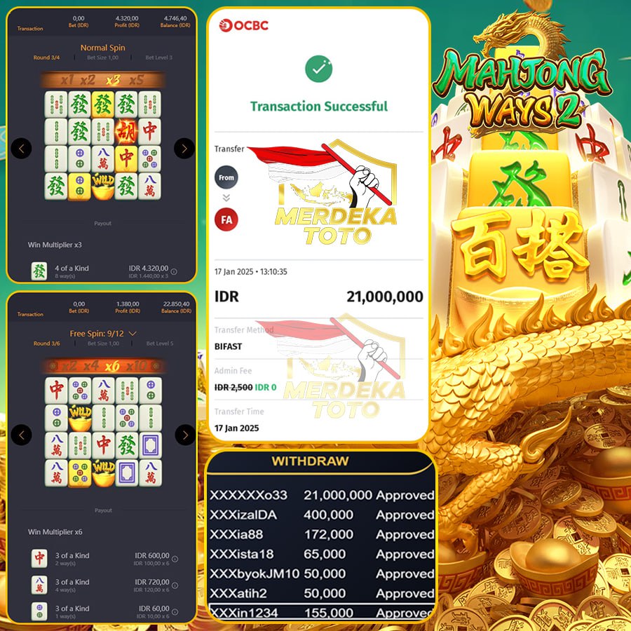 SELAMAT KEPADA MEMBER MERDEKATOTO USER ID : XXXXXXO33, MENANG DI GAME PG SOFT > MAHJONG WAYS 2