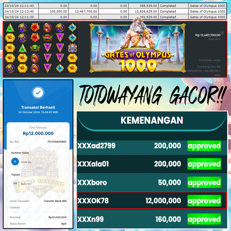 Selamat kepada user id : XXXXX78 situs TOTOWAYANG menang di PRAGMATIC SLOT > GATES OF OLYMPUS 1000