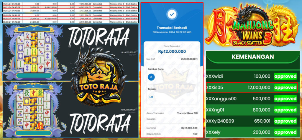 SELAMAT KEPADA MEMBER TOTORAJA, USER ID : XXXis05, MENANG DI GAME PRAGMATIC SLOT > MAHJONG WINS 3 BLACK SCATTER