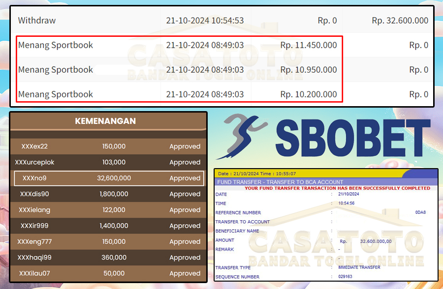 Selamat kepada member kami USER ID XXXXX09 yang telah kembali mendapatkan kemenangan besar secara terus menerus pada permainan SBOBET. Dan kemenangan yang diraih sebesar Rp.32.600.000