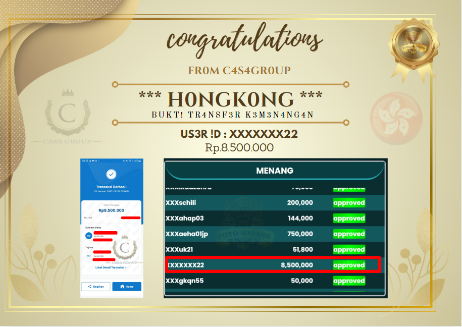 Selamat kepada User id XXXXXXX22 yang sudah berhasil CAIR lagi dari hasil bet pasaran HONGKONG di situs totowayang dengan Total pencaiaran sebesar Rp.8.500.000 langsung di bayar LUNAS, bagi yang mau mendapatkan jp seperti user id ini yukk segera daftarkan akun baru nya di bawah ini >>