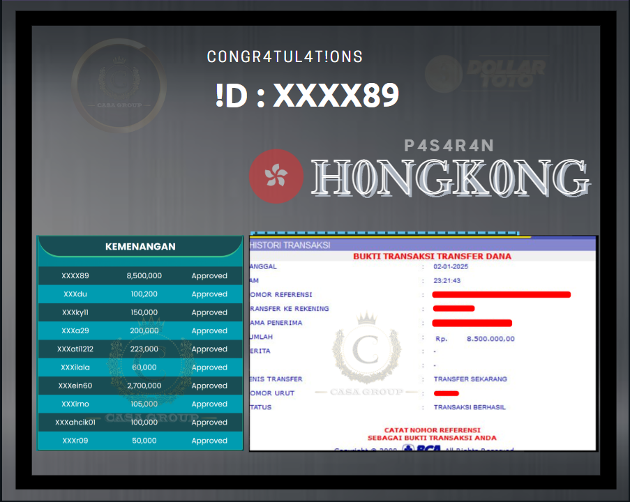 Selamatt kepada user id XXXX89 yang sudah cair di pasaran HONGKONG di situs dollartoto .