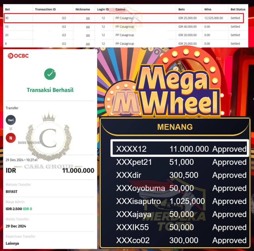 SELAMAT KEPADA MEMBER MERDEKATOTO, USER ID : XXXX12, MENANG DI GAME PRAGMATIC LIVEMEGA WHEEL