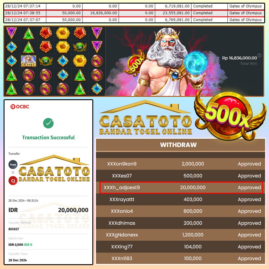 Selamat kepada bosku yang bermain di CASATOTO dengan user id XXXXXXXXXXst9 yang telah mendapatkan kemenangan besar di game GATES OF OLYMPUS > PRAGMATIC SLOT