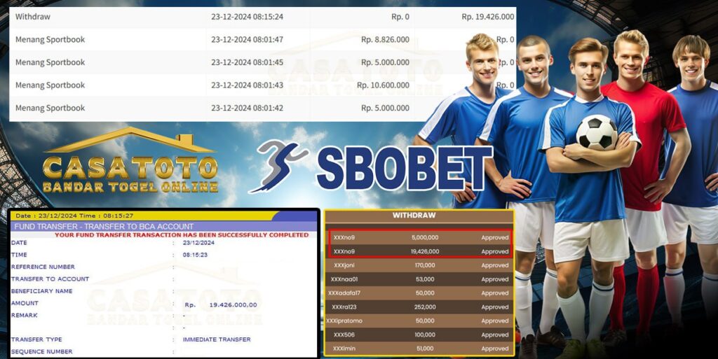 Kami ucapkan selamat kepada User ID XXXn09 yang sudah berhasil menang di permainan Sportbook ID dengan total kemenangan mencapai Rp. 19.426.000