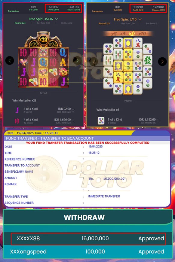 Selamat kepada member DOLLAARTOTO, user id XXXXXX88 Yang Telah Mendapatkan Kemenangan Besar di Permainan PG SOFT >> MAHYONG WAYS & WILD BANDITO
