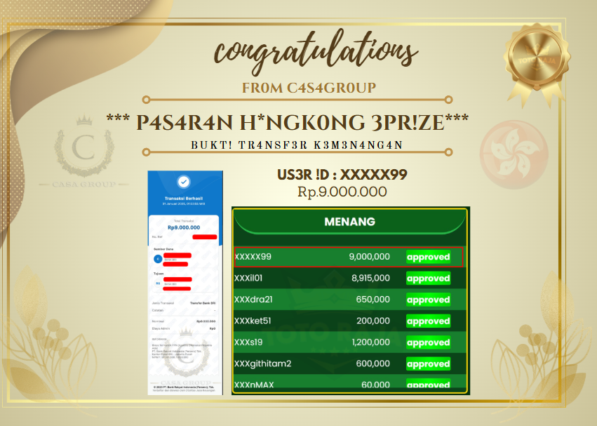 Selamat kepada User id XXXXX99 yang sudah berhasil mendapatkan cuan dari hasil bet di pasaran HONGKONG 3 PRIZE . Untuk total pencairan cuan kemenangan sebesar 9 juta langsung di bayar lunas secepat kilat ,Mari gabung bersama CASAGROUP untuk mendapatkan prediksi jitu agar bisa ikut merasakan jp di pasaran hongkong .Untuk pendaftaran akun baru bisa langsung klik di sini >>> CASAGROUP