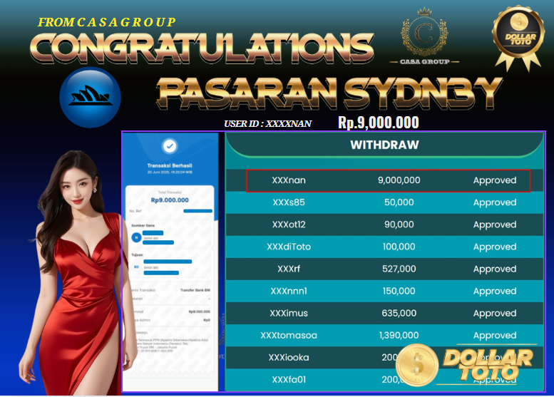 Selamat kepada user id XXXXNAN yang sudah berhasil mendapatkan cuan dari pasaran SYDNEY.