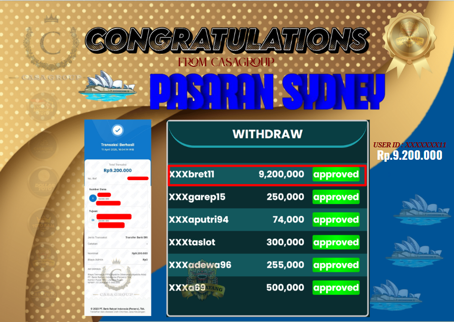 Selamat kepada User Id xxxxxxx11 yang sudah berhasil mendapatkan cuan dari hasil bet pasaran SYDNEY di situs totowayang. Untuk total pencairan kemenangan sudah berhasil di kirim ke tujuan pemenang dengan cepat tanpa ada hambatan.