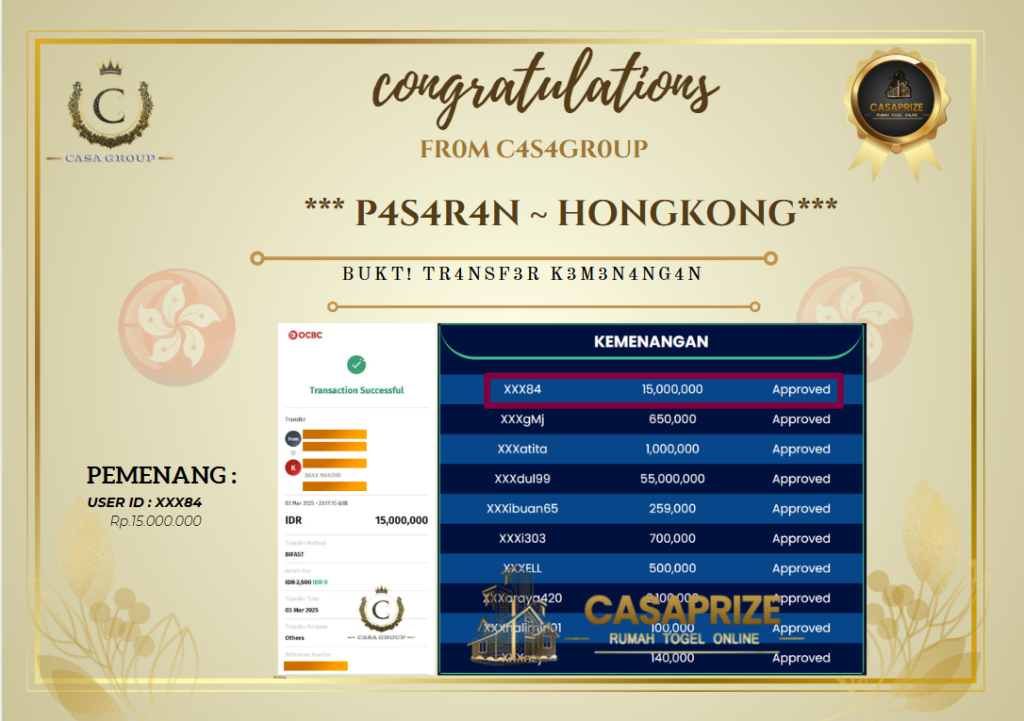Selamat kepada User id XXX84 yang sudah berhasil mendapatkan cuan dari hasil bet di pasaran HONGKONG . Untuk total pencairan cuan kemenangan 15 juta langsung di bayar lunas secepat kilat ,Mari gabung bersama CASAGROUP untuk mendapatkan prediksi jitu agar bisa ikut merasakan jp di pasaran hongkong .Untuk pendaftaran akun baru bisa langsung klik di sini LINK DAFTAR CASAGROUP