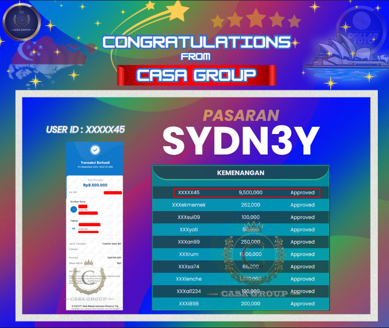 Selamat kepada User id XXXXX45 yang sudah berhasil mendapatkan cuan lagi di pasaran SYDNEY di situs dollartoto