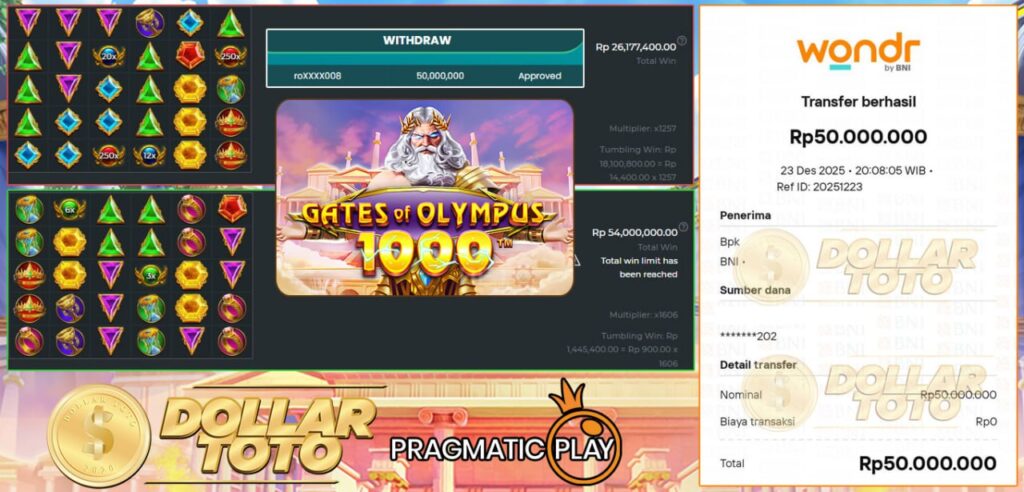 SELAMAT UNTUK MEMBER DOLLARTOTO DENGAN USERNAME Roxxxx008 BERHASIL MERAIH KEMENANGAN DI PERMAINAN GATES OF OLYMPUS 1000 >> PRAGMATIC SLOT.