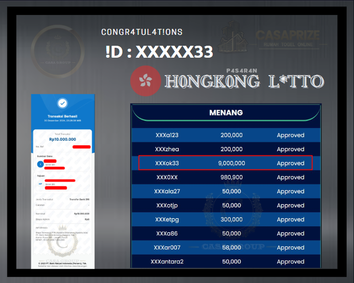 Selamat kepada user id XXXXX33 yang sudan mendapatkan cuan lagi di pasaran HONGKONG LOTTO