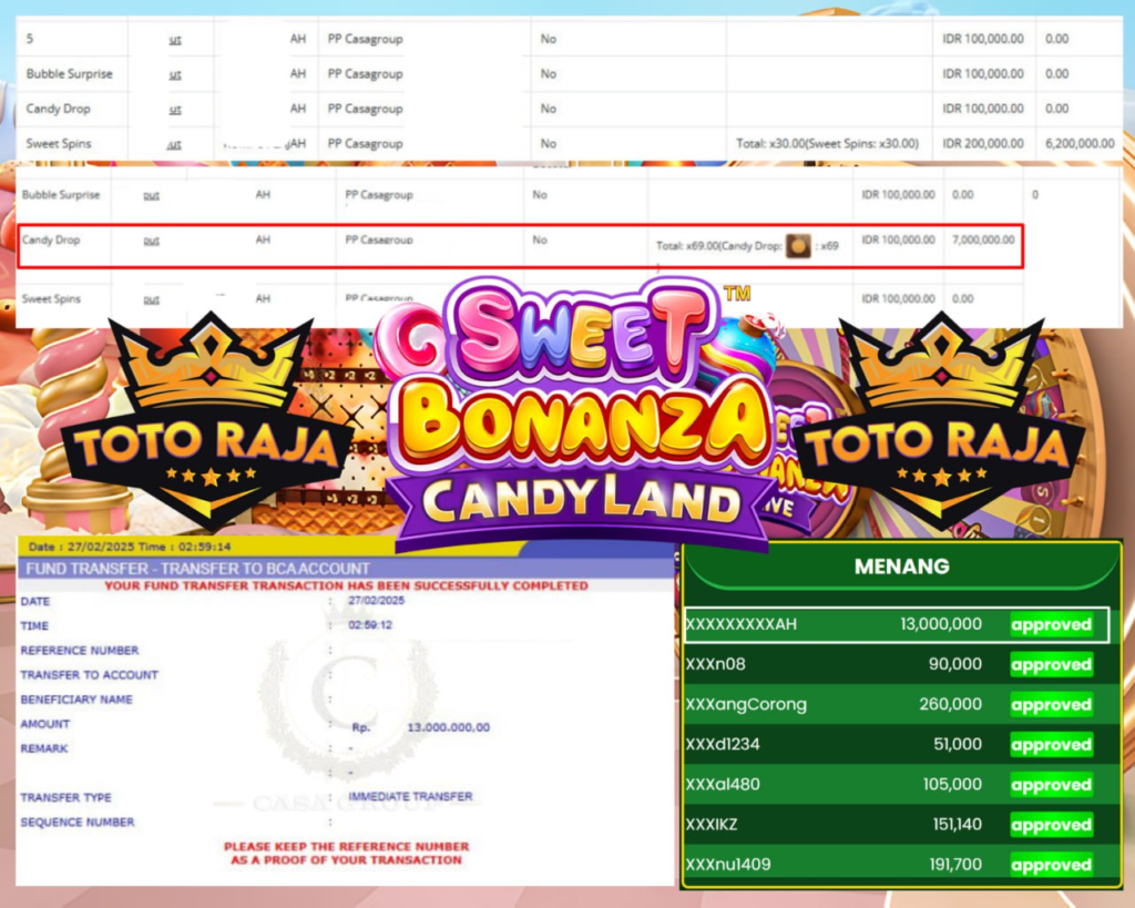 Selamat kepada bosku yang bermain di TOTORAJA dengan user id XXXXXXXXAH yang telah mendapatkan kemenangan besar di game SWEET BONANZA CANDYLAND > PRAGMATIC LIVE.