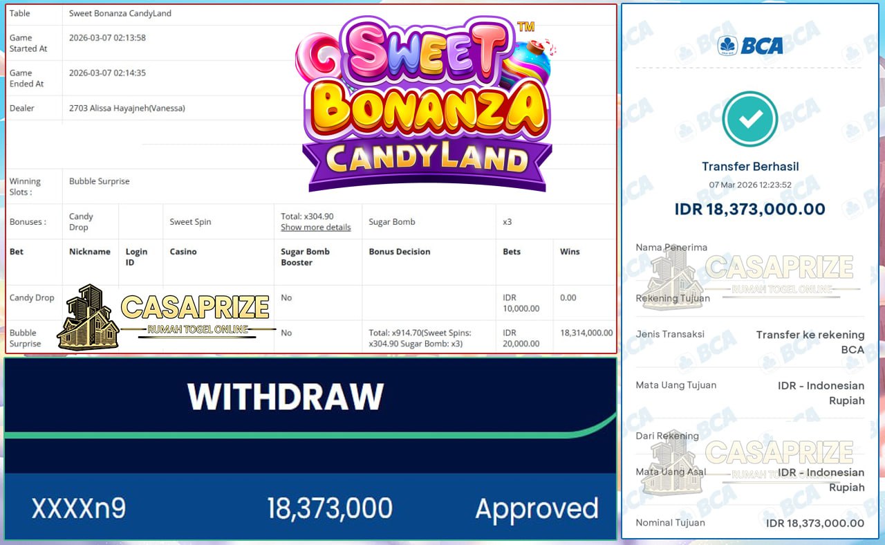 Selamat kepada bosku yang bermain di  CASAPRIZE dengan user ID XXXXn9 yang telah mendapatkan kemenangan besar di game SWEET BONANZA CANDY LAND > PRAGMATIC LIVE CASINO
