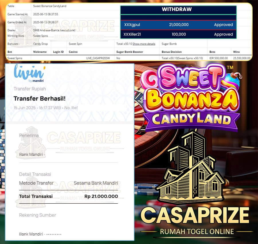 Selamat kepada bosku yang bermain di CASAPRIZE dengan user ID XXXgpul yang telah mendapatkan kemenangan besar di game SWEET BONANZA CANDY LAND > PRAGMATIC LIVE CASINO