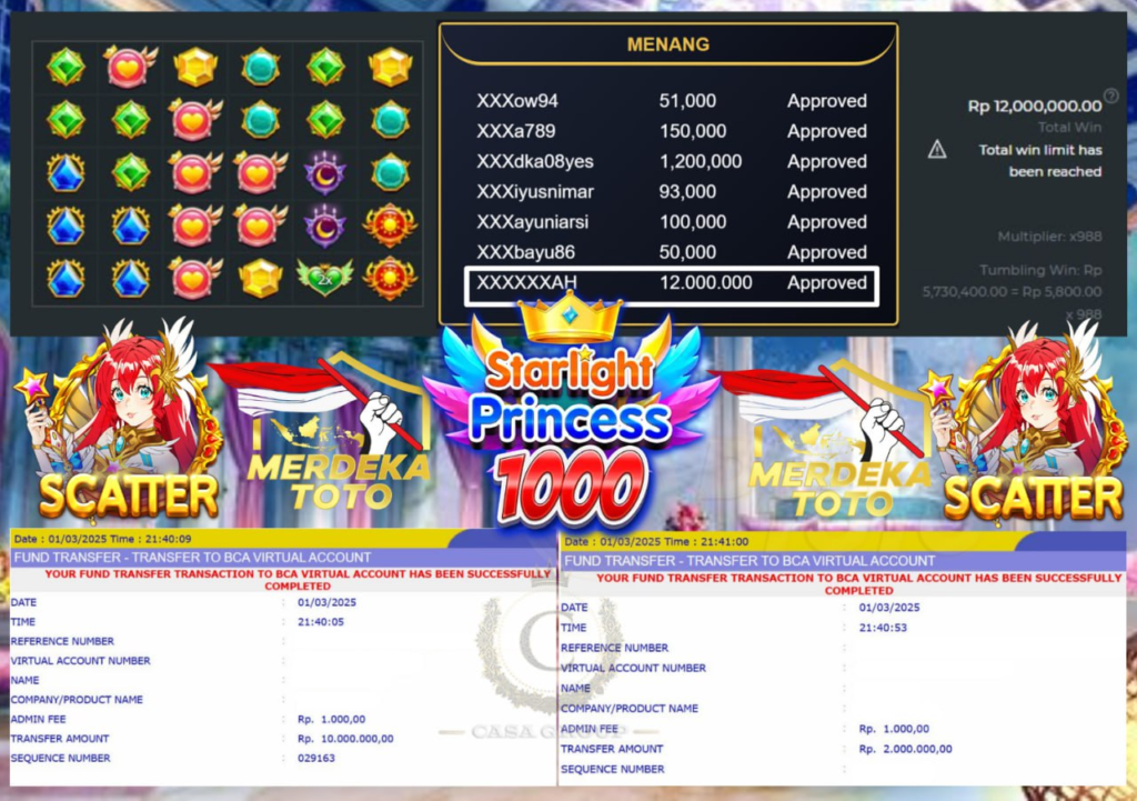 Selamat Kepada Member MERDEKATOTO dengan User ID XXXXXXXAH Atas Kemenangan di Game STARLIGHT PRINCESS 1000 – PRAGMATIC PLAY.