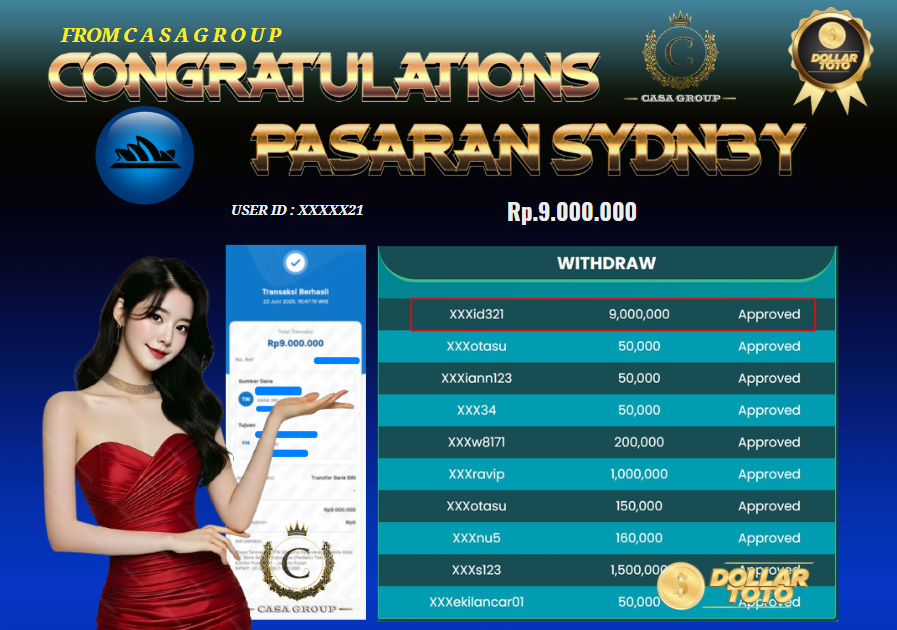 Selamat kepada User id XXXXX21 yang sudah berhasil mendapatkan cuan dari hasil bet di pasaran SYDNeY. Untuk total pencairan cuan kemenangan 9 juta langsung di bayar lunas secepat kilat ,