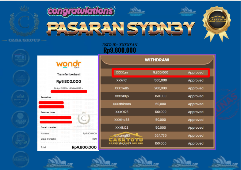 Selamat kepada user id XXXXAN yang sudah berhasil mendapatkan cuan dari pasaran SYDNEY. Untuk total pencairan sebesar Rp.9.800.000 langsung di bayar LUNAS dan gak pakai lama.