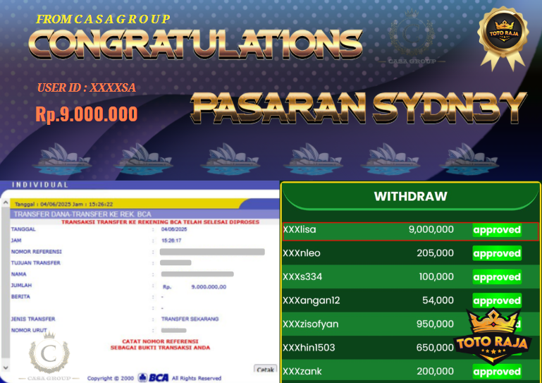 Selamat kepada User id XXXXsa yang sudah berhasil mendapatkan cuan dari hasil bet di pasaran SYDNEY. Untuk total pencairan cuan kemenangan 9juta langsung di bayar lunas secepat kilat ,Mari gabung bersama CASAGROUP untuk mendapatkan prediksi jitu agar bisa ikut merasakan jp di pasaran SYDNEY.