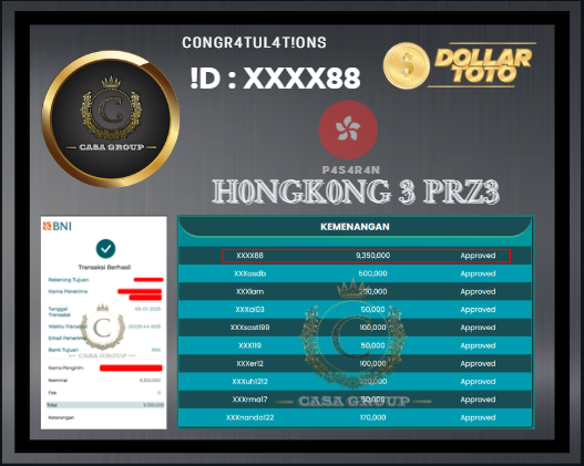 Selamat kepada user id xxxx88 yang sudah berhasil jackpot di pasaran HONGKONG 3 PRIZE di situs DOLLARTOTO . Untuk nominal pencairan sebesar Rp.9.350.000 sudah di bayar LUNAS secepat kilat ,