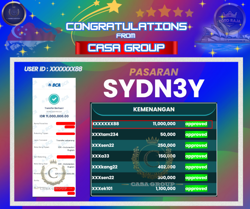 Selamat kepada user id XXXXXXX88 yang sudah dapat cuan dari pasaran SYDNEY di situs totoraja