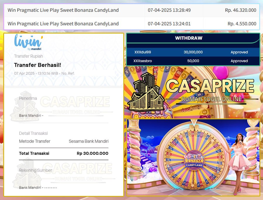 Selamat Kepada Member CASAGROUP dengan Username XXXXX99 Yang Beruntung Mendapatkan Kemenangan Besar di CASAPRIZE Dalam Permainan PRAGMATIC CASINO >> SWEET BONANZA CANDY LAND