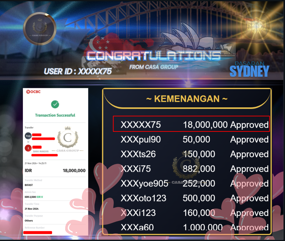 Selamat atas kemenangan kepada User Id : xxxxx75 yang telah menang besar di pasaran SYDNEY