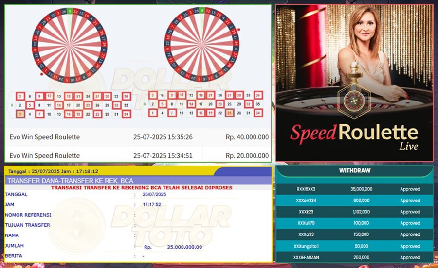 Selamat kepada member DOLLARTOTO dengan user ID RXXiXX3 yang jacpot dengan kemenangan besar dari EVOLUTION GAMING CASINO – SPEED ROULETTE. Total kemenangan sebesar Rp. 35.000.000 telah kami bayar lunas tanpa potongan sedikit pun. Saatnya bosku buktikan sendiri kemenangan sesungguhnya ada di DOLLARTOTO!