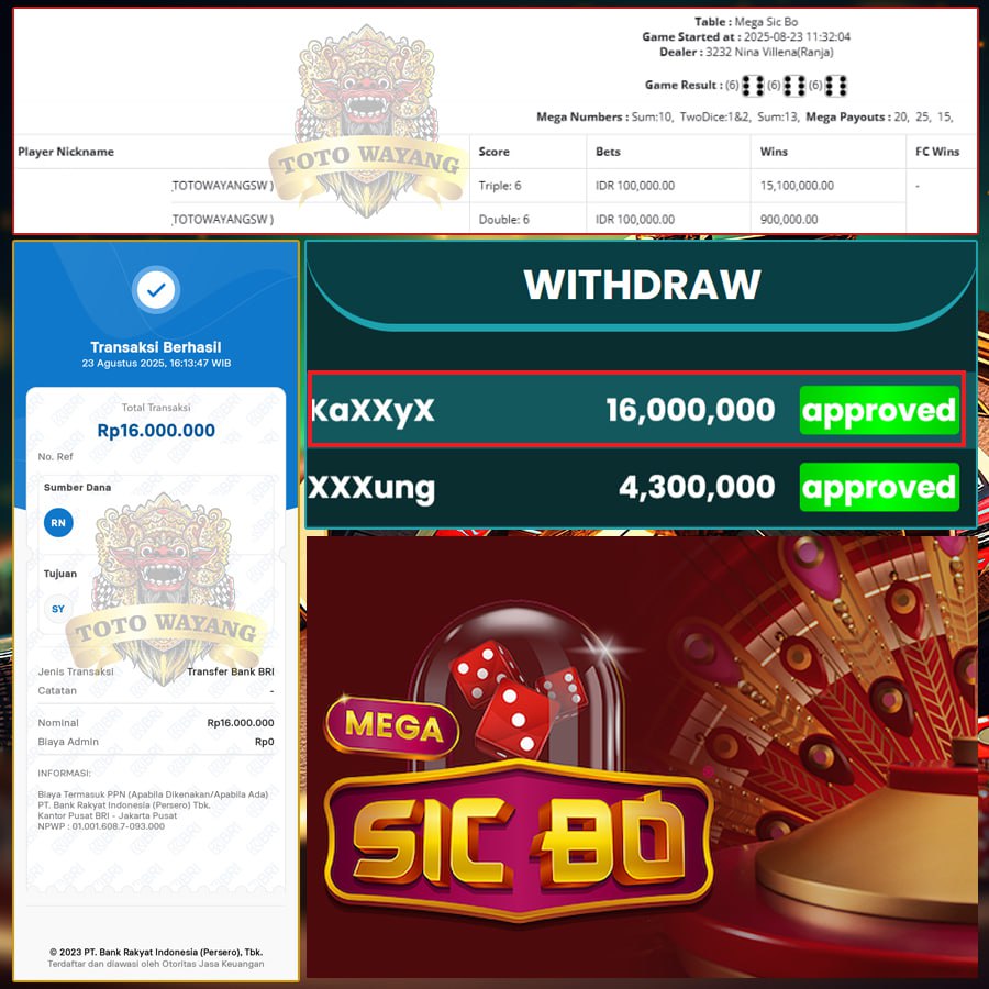 Selamat atas kemenangan boss ku dengan user id KaXXyX yang telah mendapatkan kemenangan besar di TOTWAYANG GAME MEGA SIC BO dengan kemenangan yang luar biasa.