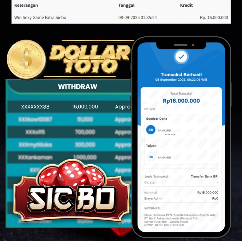Selamat atas kemenangan boss ku dengan user id xxxxxxx88 yang telah mendapatkan kemenangan besar di DOLLARTOTO GAME MEGA SIC BO dengan kemenangan yang luar biasa.