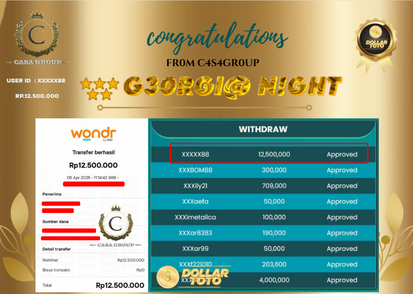 Selamat kepada user id XXXX88 yang sudah berhasil mendapatkan cuan dari pasaran GEORGIA NIGHT.
