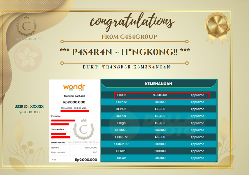 Selamat kepada user id XXXXIX yang sudah berhasil mendapatkan cuan dari pasaran HONGKONG .Untuk total pencairan sebesar 9 juta langsung di bayar LUNAS dan gak pakai lama ,Hanya di BO naungan casagroup yang paling Aman & Terpercaya .Bagi yang mau ikut Yukk segera daftarkan akun baru nya di >> CASAGROUP