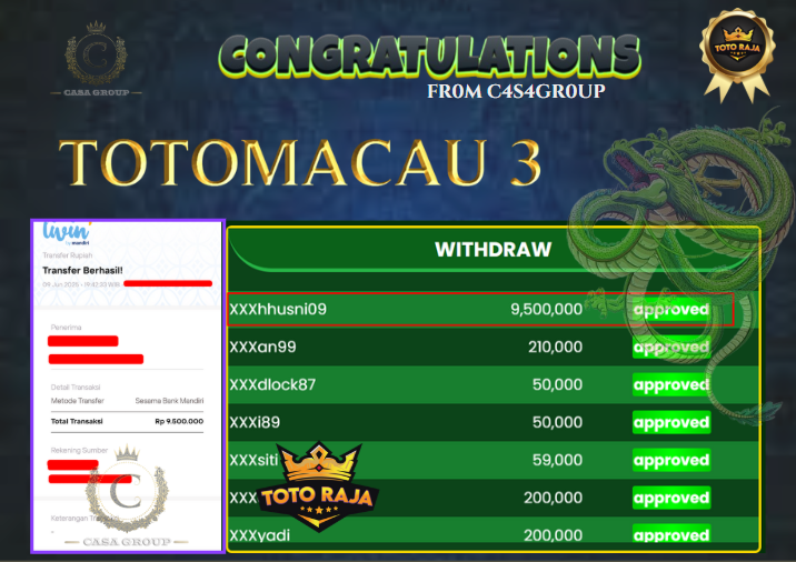 Selamat kepada user id XXXXXXX09 yang sudah berhasil mendapatkan cuan dari pasaran TOTOMACAU 3 .Untuk total pencairan sebesar Rp.9.500.000 langsung di bayar LUNAS dan gak pakai lama ,Hanya di BO naungan casagroup yang paling Aman & Terpercaya .Bagi yang mau ikut Yukk segera daftarkan akun baru nya di >> CASAGROUP