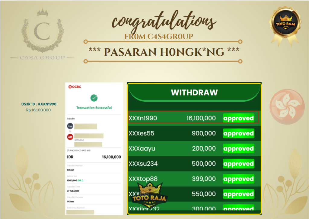 Selamat kepada User id XXXN1990 yang sudah berhasil mendapatkan cuan dari hasil bet di pasaran HONGKONG . Untuk total pencairan cuan kemenangan sebesar Rp.16.100.000 langsung di bayar lunas secepat kilat ,Mari gabung bersama CASAGROUP untuk mendapatkan prediksi jitu agar bisa ikut merasakan jp di pasaran hongkong .Untuk pendaftaran akun baru bisa langsung klik di sini >> Link Daftar >> CASAGROUP <<
