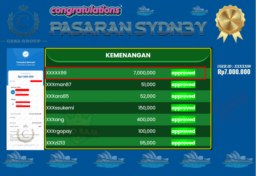 Selamat kepada user id XXXXX99 yang sudah berhasil mendapatkan cuan dari pasaran SYDNEY, Untuk total pencairan sebesar 7 juta langsung di bayar LUNAS dan gak pakai lama.