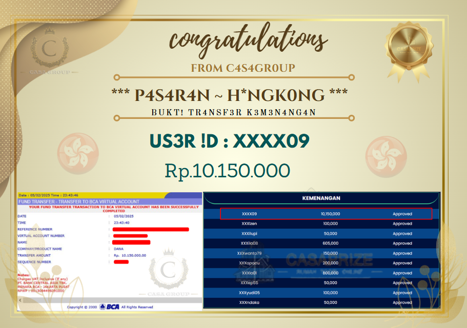 Selamat kepada User id XXXX09 yang sudah berhasil mendapatkan cuan dari hasil bet di pasaran HONGKONG . Untuk total pencairan cuan kemenangan sebesar Rp.10.150.000 langsung di bayar lunas secepat kilat ,Mari gabung bersama CASAGROUP untuk mendapatkan prediksi jitu agar bisa ikut merasakan jp di pasaran hongkong .Untuk pendaftaran akun baru bisa langsung klik di sini >>  CASAGROUP