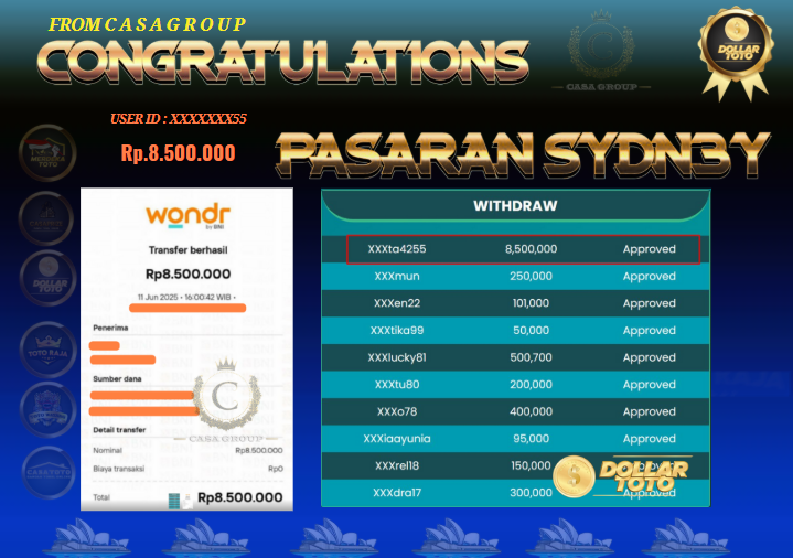 Selamat atas keburuntungan yang berpihak kepada user id xxxxxXX55 yang sudah mendapatkan rezeki dari bet SYDNEY di situs dollartoto total kemenangan sebesar Rp,8.500.000 telah di bayar lunas dan secepat kilat ,