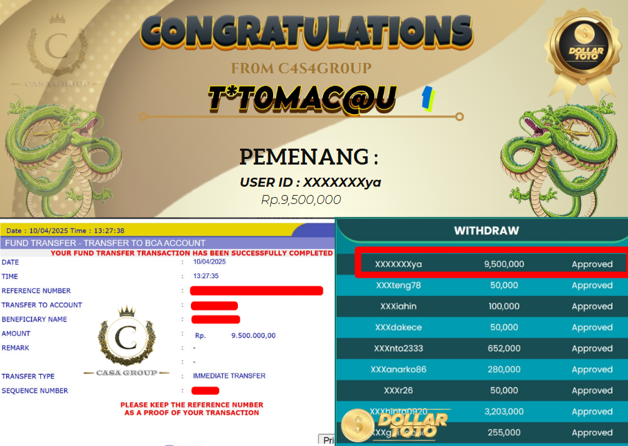 Selamat atas keburuntungan yang berpihak kepada user id XXXXXXYA yang sudah mendapatkan rezeki dari bet TOTOMACAU 1 di situs dollartoto, Total kemenangan sebesar Rp.9.900.000 telah di bayar lunas dan secepat kila.,