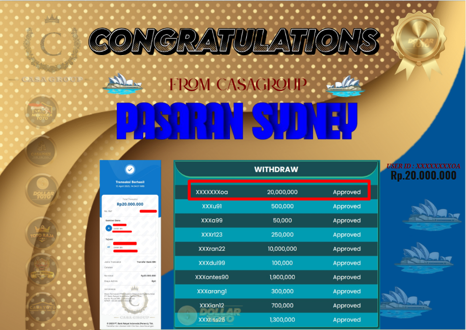 Selamat kepada User id XXXXXXXOA yang sudah berhasil mendapatkan win besar dari hasil bet pasaran SYDNEY di situs dollartoto dengan Total pencaiaran sebesar 20 juta langsung di bayar LUNAS,bagi yang mau mendapatkan jp seperti user id ini yukk segera daftarkan akun baru nya di bawah ini >>