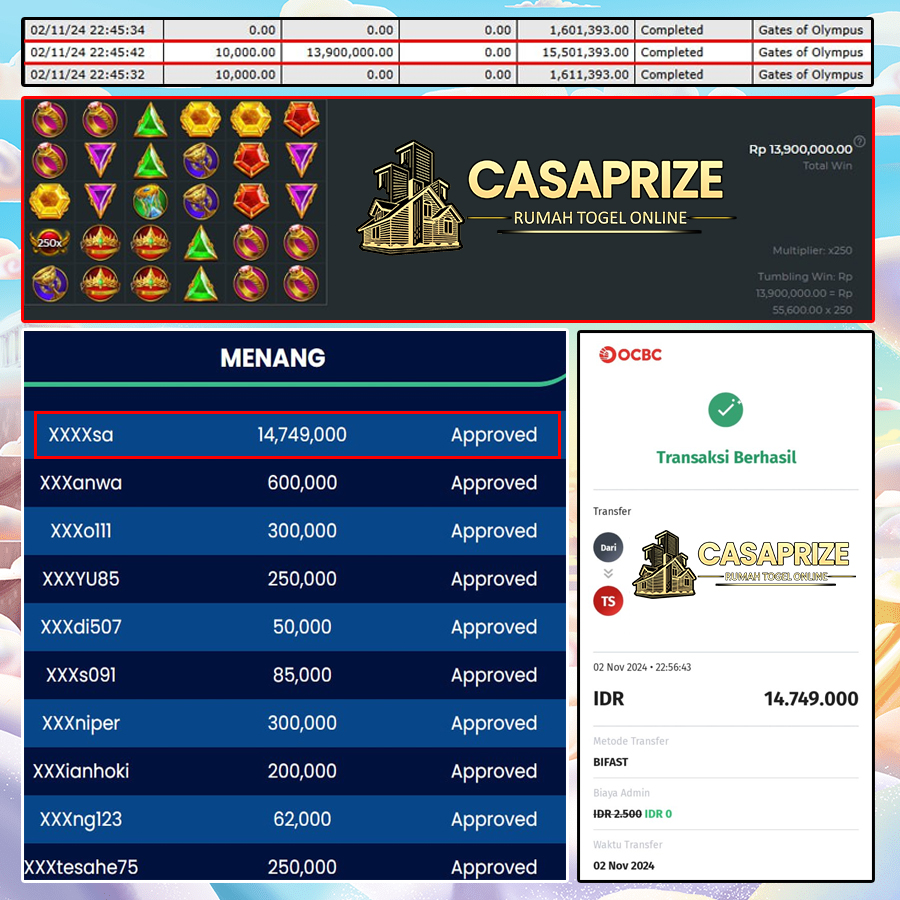TOTAL KEMENANGAN MENCAPAI RP.14.749.000. DI BAYAR LUNAS TANPA POTONGAN APAPUN.